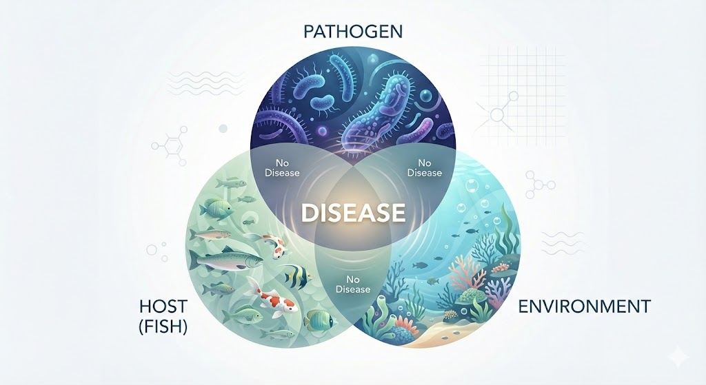 Rather than addressing disease as an isolated event, we focus on the biological processes that shape disease emergence, persistence, and control across aquatic systems.